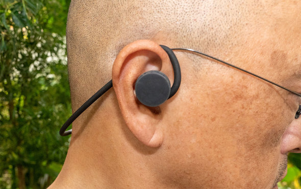 耳に引っ掛けているだけだが、適度なバネが効いているため、やや左右から締め付けられているような感覚がある。その分、激しい運動でもずれてしまうようなことはなさそうだ。本体はIP55相当の防水/防じん仕様なので、運動で汗をかいたり、雨に降られたりしても問題ない。