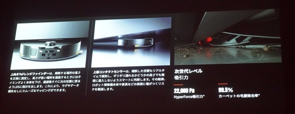 昇降式LDSレーザーセンサーは、事前に環境を測定して家具下に潜るタイミングで本体へ格納されるので、ぶつかって傷つくことはない。本体上部にあるコンタクトセンサーによって傾斜した空間を検知するため、不安定な場所に侵入することも避けられるという薄いボディーながら吸引力は最大2万2000Paを確保し、大きなごみからハウスダストまで吸引できる。メインブラシには、毛髪を中心のダストボックスまでよける機構を備えているため、毛が絡みにくい。さらにサイドブラシによって壁際にたまりがちなペットの毛なども逃さず吸える。これらの性能については第三者機関によて検証済みだという。