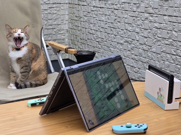 続いて、家庭用ゲーム機のNintendo Switchを付属のHDMI to Mini HDMIケーブルで接続してみた。対面した2人がゲーム対戦しているという体(てい)で、DUOONE OLED FOLDの上部のディスプレイを反対側に折り曲げる。