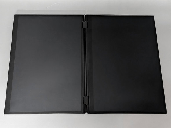 ボディーは16型の画面が上下に連結された構造で、背面のスタンドを用いて自立させる。縦向きを基本としているが、横向きでの設置もサポートする。2画面を連結して1つの画面として扱えるだけでなく、二つ折りにして背中合わせの状態でミラーリング表示することも可能だ。詳しくは後述する。