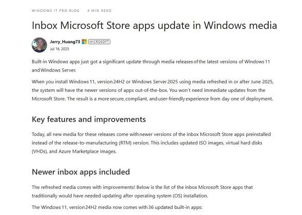 これまで新しくWindowsをインストールすると、プリインストールされた標準アプリが古いバージョンのままのため、Microsoft Storeから大量のアップデートをダウンロードする必要があった。この問題を解決するため、同社は2025年6月以降、月次でメディアを更新し、最新のアプリバージョンをすぐに利用できるようにするという。