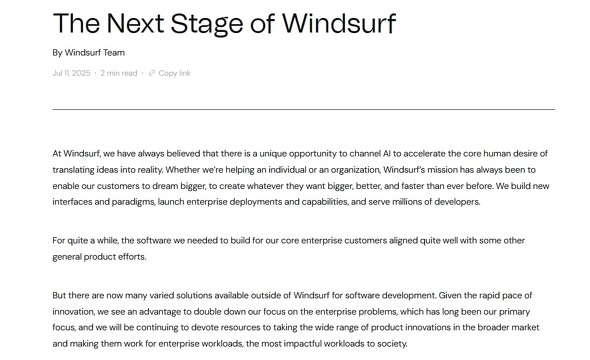 経営陣を含め、主要なR&Dメンバーが抜けるWindsurfだが、「Windsurfの世界クラスチームの大部分は、引き続きWindsurf製品の構築に専念し、顧客がこの技術の導入による利益を最大化できるよう支援する」と説明している。