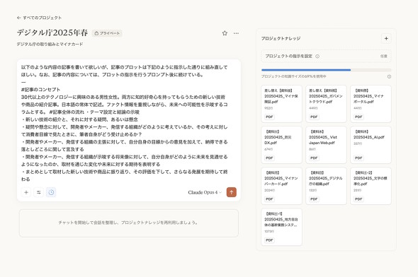 実際の事例として、2025年初頭にデジタル庁が実施した記者会見での音声や配布資料を基に、「マイナンバーカード」関連の情報を整理して出力してもらう。資料のPDFファイル(10個)あらかじめアップロードした上で、「デジタル庁はマイナンバーカードを基盤にどのようなサービスを展開していくのか?」と指示を行った。