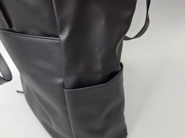 合成皮革と聞くと、チープなイメージを持つかもしれないが、ほどよく柔軟性があって手触りは滑らか、さらにシボ加工も施されているため、一瞬「山羊革かな?」と思うような感触がある。PVC(ポリ塩化ビニール)製と思われる合成皮革は本革と異なり、水に強く、色移りもせず、湿度の高い国内で日常的に使うにはぴったりの素材だといえるだろう。