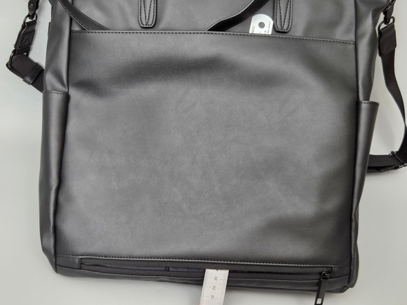 フロントには、スマートフォンなど頻繁に出し入れする小物を入れておくのに便利なあおりポケットを備えている。マグネットホックスタイルなので、簡単に取り出せるし、入れた後にバッグを逆さにしても中身が落ちることがない。