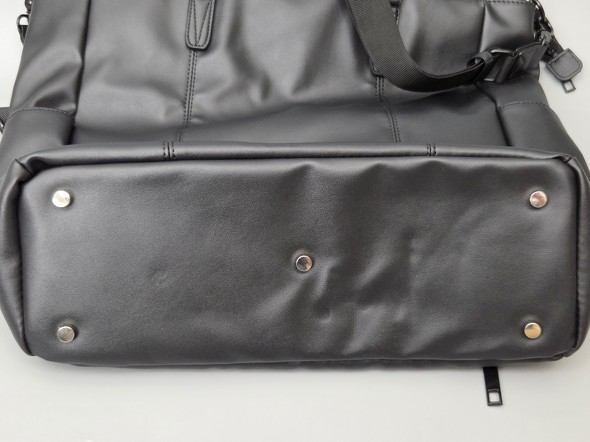 ORGULLO トートバッグの底には、5つの鋲(びょう)が取り付けられている。このおかげで、底部が汚れたり傷ついたりすることをある程度は防げ、バッグの転倒も防止する。もし倒れてしまっても、ファスナーがあるので中身が出ることはない。