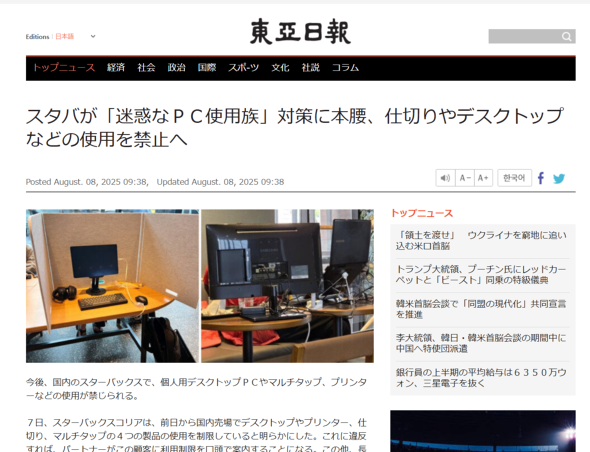 「店内に個人用デスクトップPCや電源マルチタップ、プリンタ、パーティション(仕切り板)などは持ち込まないで」──コーヒーチェーン「スターバックス」の韓国法人が、店内における過度な席の占有を明確に禁止したと、東亜日報やBBC Newsなどが報じた。