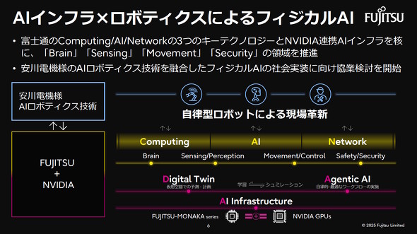 富士通は、データセンター/HPC(ハイパフォーマンスコンピューティング)向けにArmアーキテクチャベースのCPUであるFUJITSU-MONAKAシリーズの開発を進めている。このCPUとNVIDIAのデータセンター/HPC向けGPUをNVIDIA NVLink Fusionを介して密結合することで、ゼタスケールの演算性能を備える高速AIコンピューティング基盤を共同開発する。