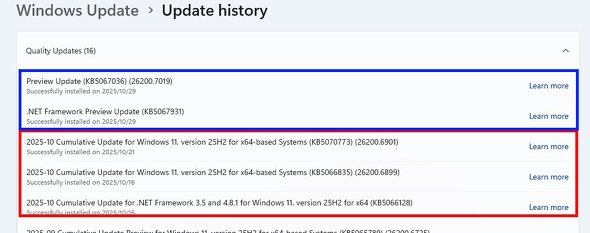 注目的の1つは、アップデートの名称が今回(2025年10月)から変更された点で、従来まで「累積更新プログラム(Cumulative Update)」の名称で提供されていたものが、「セキュリティ更新プログラム(Security Update)」「プレビュー更新プログラム(Preview Update)」の形でセキュリティパッチとそれ以外のアップデートの形で示されるようになった。