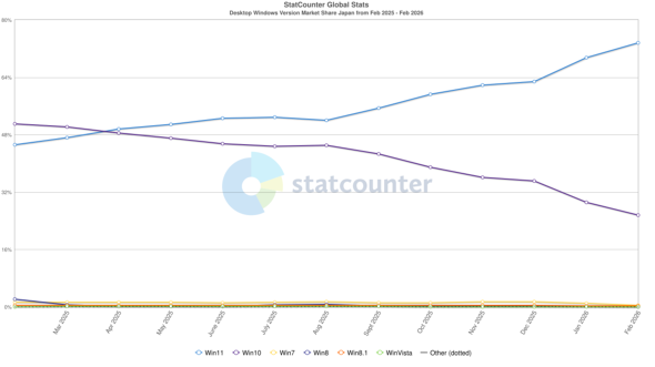 恒例のトピックになるが、StatCounterによれば2026年2月時点でのWindows OSのバージョン別シェアは、世界全体でWindows 11が72.75%、Windows 10が26.54%となっており、1月時点のデータにあったWindows 11の62.41%から大幅に上昇している。