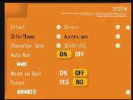 スキンを変更するにはNANDメモリ(内蔵メモリ)のフォルダ“skin”に置く必要がある。ただし、デフォルトではフォルダが存在していないので、手作業でskinフォルダを作らなくてはならないのだが、GP2xのエクスプローラはフォルダの操作ができない。うーん。