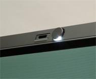 液晶天面部分に折りたたみ式のHSDPA用アンテナ(写真=左)、右側面に指紋認証ユニットがある(写真=中央)。液晶上部には「HP Night Light」が用意され、丸い部分を押すだけでライトが点灯する(写真=右)