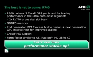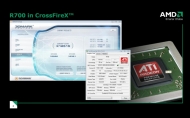 AMD 上級副社長兼グラフィックス製品事業部ジェネラルマネージャのリック・バーグマン氏は「R700には2つのRV770が搭載される。GDDR5メモリを採用し、PCI ExpressのブリッジチップもGen2になり、GPU間の接続も改良される。これらのおかげで、1枚のグラフィックスカードで2TFLOPSを実現することになる」と延べ、R700の概要を紹介した。なお、R700でもCrossFire Xがサポートされるので、R700を2枚組み合わせた4GPU構成も可能になる。