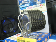 最後はそのほかの注目アイテムを紹介したい。複数のショップのCPUクーラー売り場で注目を集めていたのが、サーマルティクの「SpinQ CL-P0466」だ。LGA 1366/775とSocket AM2/939/754に対応する大型CPUクーラーで、CPUと水平方向の風を送る独特の形状が特徴。ファンを包む筒状のフィンは、コーナーを少しずつずらすことでらせん形状となり、排熱を効率化させる働きを持つという。T-ZONE.PC DIY SHOPは「風が一直線ではなく、フィンの隙間から漏れやすくなるので、CPUの周囲が冷やしやすい特徴があります。まあ、見た目のおもしろさで売れているというのもありますけど」と語る。