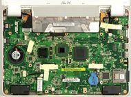 左が1000HE、右が1000H-Xの底面で、いずれもネジで固定されたカバーを外し、HDDとメモリを露出した状態。1000HEにはHDDを覆う金属製のカバーが追加されている。1000H-Xはカバー部分の周辺が隆起しており、カバーを取り外すと無線LANモジュールを搭載したMini PCI Expressスロットも露出するが、1000HEでは隠されている(スロット自体はHDDの左にある)。マザーボードのレイアウトは表面と異なり、少し変更されている。どちらもHDD周辺が発熱しやすい高い負荷をかけた場合の騒音は?