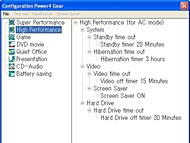 キーボードの奥には、電源ボタンのほかに2つのワンタッチボタンが用意されている(写真=左)。電源ボタンは青く光り、高級感を演出している。Power 4 Gearでは「High Performance」「Power Saving」「Game」「Quiet Office」「DVD Movie」など、用途ごとにプリセットが用意されている(写真=中央/右)。ユーティリティはタスクバーに常駐しており、それぞれの設定をカスタマイズして使うことも可能だ関連キーワード