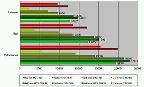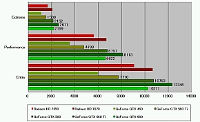 3DMark 11におけるDirectX 11性能比較では、GeForce GTX 660 Tiの下であることは当然だが、Extreme設定でGeForce GTX 580をわずかに上回るスコアを記録した。一方、GeForce GTX 560 TiやGeForce GTX 460と比較してみると、GeForce GTX 460からGeForce GTX 560 Tiという世代交代では、Performance設定で1200ポイント程度の向上だが、GeForce GTX 560 TiからGeForce GTX 660への世代交代では1800ポイントとより大きな差が出た。GeForce GTX 460からGeForce GTX 660へのアップグレードでは3000ポイント以上の差となり、フレームレートの違いを明確に体感できる。Radeon HD 7870との比較では、3DMark Vntageと同様に高画質設定で上回るという結果だ。