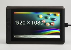 13HDは、13.3型フルHD(1920×1080ドット)のディスプレイを採用しており、12WXの12.1型WXGA(1280×800ドット)からサイズ、解像度ともに向上している。特に画素ピッチが0.15×0.15ミリと、さらに高画素密度化しているのがウレシイ。表示が細かくなったことでグラフィックソフトウェアのコントロールパネルなどが従来より場所を取らなくなり、キャンバスを広く確保できる。また、表示がなめらかなので、より紙に近い感覚で気持よく線が引けた。