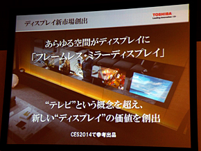 7日に開幕する「2014 International CES」に先立ち、東芝がプレスブリーフィングを開催。プレミアム4Kモデルを披露したほか、フレームレスの新コンセプトテレビや据え置きタブレットを参考展示することを明らかにした。