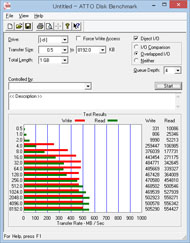 左から、500Mバイト時と100Mバイト時の結果。データのファイルサイズが小さくなるほどシーケンシャルリードは遅くなる一方、500Mバイト時のシーケンシャルライト、512KBライトは、検証中最もよいスコアとなった