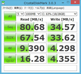 eMMCにはHynixのHBG4eという製品が使われていたが、そのCrystalDiskMarkのスコアはeMMCとしては標準的なスコアである。Ultrabookなどが搭載しているSSDと比べるとかなり見劣るが、ランダムアクセスのスコアはHDDに比べれば格段に優秀であり、Windows 8.1の日常操作レベルでモタつきなどを感じることなく快適に使うことができる。