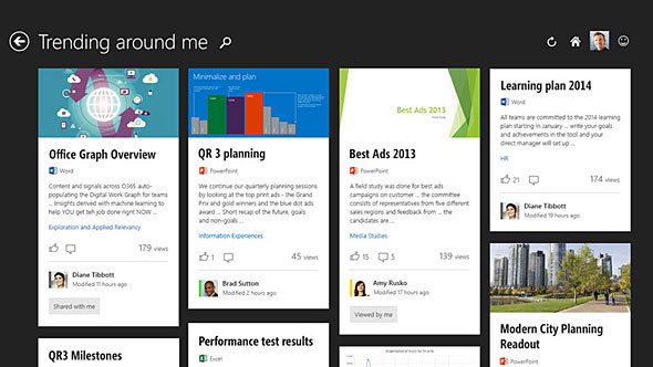 必要な情報はExchange Online、SharePoint Online、Yammerでのユーザーの活動を基にパーソナライズが行われており、Office Graphによって可視化されている。これを取り出すアプリがOsloというわけだ。Windows 8アプリの形で提供されるが、正式ローンチのタイミングでは正式な製品名が付与されるとのこと。少し暴力的な言い方をすれば、Androidでいうところの「Google Now」みたいなものを想像してみれば分かりやすい。