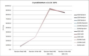 また、テストデータ量を変更しても、リードこそやや上下するものの、ライトはほぼ一定の速度だった。IOPSは、Random Read 4KB (QD=32)で94539.8IOPS、同ライトで86207.1IOPSだった。やや低いが、おおむね公称値どおりだろう。