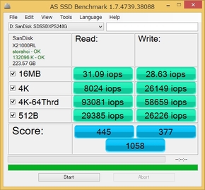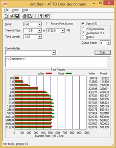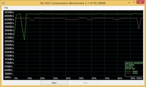 「CrystalDiskMark 3.0.3b」では、シーケンシャルリードが520Mバイト/秒、シーケンシャルライトが491Mバイト/秒というスコアとなった。ランダムデータと0Fillで転送速度が変わるようなことはなく、コントローラ内部で圧縮と伸張を行うような挙動は見られなかった。