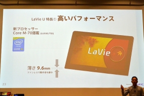 なお、同じような本体とキーボードが着脱式のLaVie W Tabとの違いについて、NECパーソナルコンピュータの関係者は、本体形状や搭載するインタフェース、キーボードのピッチやストロークがほぼ同じであるとしながらも、11.6型ディスプレイを採用してCPUにCore Mシリーズを搭載するLaVie Uは「コンテンツを生み出す用途」に適している一方で、10.1型ディスプレイと採用してCPUにAtom Z3745を搭載するLaVie Tab Wはコンテンツを消費する用途」に適していると説明している。