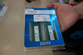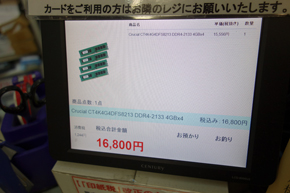 取材時に同店で最安だったのは、クルーシャルのPC4-17000(DDR4-2133)対応16Gキット「CT4K4G4DFS8213」。価格は1万6800円だったが、「週明けの価格改定で別のものがコレより低くなることも十分考えられます」とのことだ。