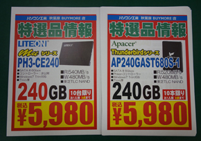 パソコン工房 秋葉原BUYMORE店で目立っていたのは、LITEON「Mu2 PH3-CE240」とApacer「Thunderbird AP240GAST680S-1」の両240Gバイトモデル。ともに税込み5980円としている。そのほかにも、Apacerの960GバイトSSD「AS330 PANTHER AP960GAS330」が同2万1980円となるなど、容量単価をぐっと押し下げる特価がみられた。