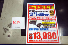 パソコン工房 秋葉原BUYMORE店では、FSPの80PLUS GOLD認証電源「AURUM」シリーズのアウトレット品が特価で売られている。定格1200Wの「AU-1200PRO」が税込み1万3980円で、600Wの「AU-600」が同4980円、400Wの「AU-400」が同3980円となる。週末を前に在庫は10台と2台、4台だった。