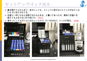 橋田 そのインク充填にしても、ボトルの注入口の形が1色ごとに違ってるんですね。一見しただけだと同じように見えてしまいますが、タンクの色と異なるボトルを差そうとしても注入できないようになってます。細かい配慮に感心しました。