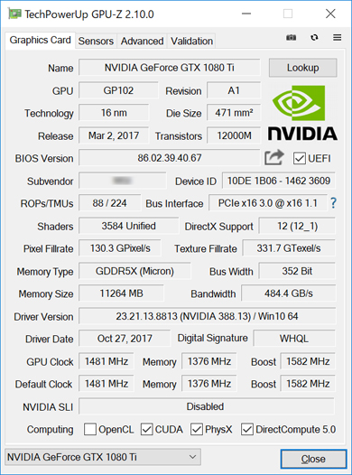 GPUはNVIDIA GeForce GTX 1080 Ti。執筆時点で市販されている中ではNVIDIAのコンシューマー向け最上位のGPUだ。GPUコア数も多く、動作クロックも高く4Kゲーミングを見据えたGPUであり、高画質なテクスチャを扱っても十分な11GBのGDDR5メモリを搭載している。クーラーについては先に紹介した通り。その他に1つ補足しておけば、ここもLEDは搭載していない。