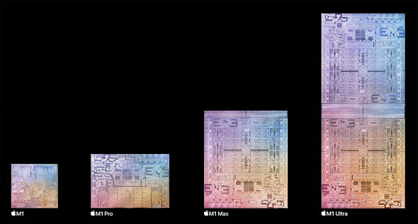 M1 Maxが登場した時には、「Max(最大)」という名前もあってM1プロセッサの性能は、これで頭打ちだと多くの人が思っていたはずだ。しかし、Appleは実はこのM1 Maxプロセッサに2つのプロセッサを高速接続するすべを用意していた。M1 Ultraは、これを用いて2つのM1 Maxを連結させて1チップ化したSoCで、最大20コアCPU(高性能16コア+高効率4コア)、64コアGPU、32コアNeural EngineをBTOで選ぶことも可能だ。