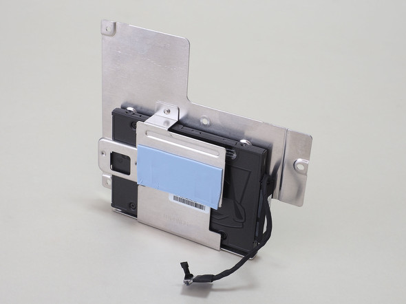 このストレージトレーは2.5インチSSD/HDD用のもので3つのネジによって本体フレームに固定されている。ストレージトレーはボディー側、マザーボード側双方に熱伝導シートが貼られている。マザーボード側の熱をフレームに伝え、その熱を金属カバーへと逃がすためだ。