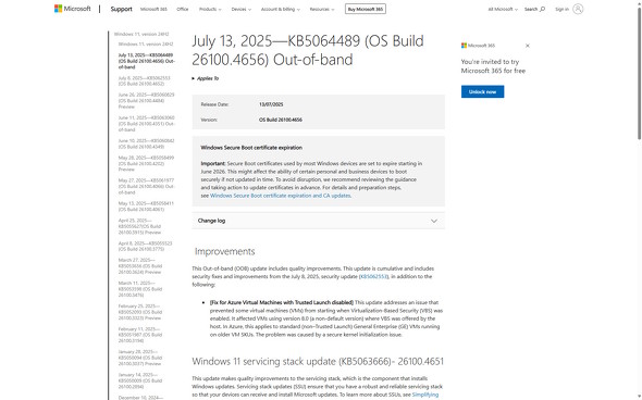 本件は、当該のVMにおいてトラステッド起動を有効化すれば回避できる。また、Microsoftでは本件への対処として7月13日から不定期更新(KB5064489)の配信を開始した。本事象が発生する可能性のある環境では、KB5062553の代わりにKB5064489を適用するとトラステッド起動を無効にした状態でも事象を回避可能だ。