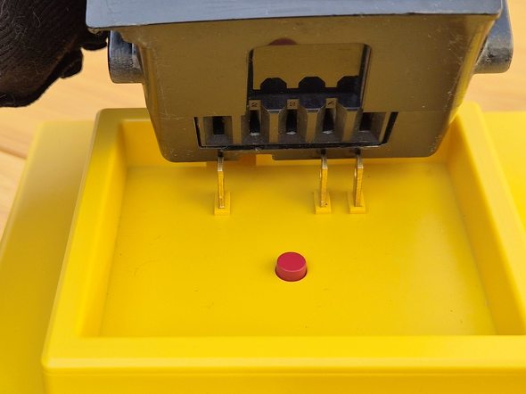 レビューで使った電動アシスト自転車用バッテリーはパナソニック製のNKY580B02(16Ah)だ。バッテリーホルダー内の3本の端子にバッテリーの差込口がピッタリ合うように差し込む。差し込み後にぐらつかなければ準備完了だ。