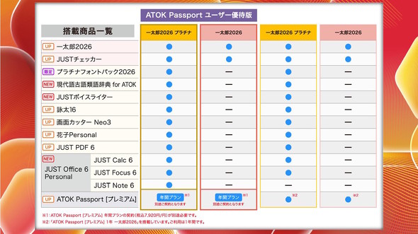 一太郎2026シリーズには、直販限定で既存の一太郎ユーザー向けの「バージョンアップ版」、と「ATOK Passport プレミアム」の契約者向けの「ATOK Passportユーザー優待版」も用意される(ATOK Passportユーザー優待版の購入には、ATOK Passport プレミアムの年間契約が必要)。
