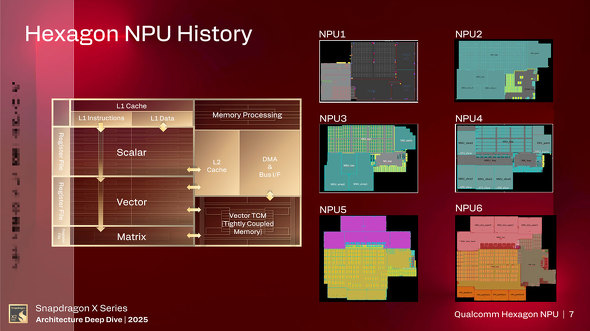 このNPUはQualcomm内部で世代管理されているようで、前世代のSnapdragon X Eliteに搭載されているのが「NPU3」で、X2 Eliteの世代では「NPU6」となっている。具体的に各世代でどのような設計思想をもって差異が生まれているのか不明だが、少なくともAIの進化の時流に合わせ、少し先の将来を読むことでどの演算ユニットを強化していくのかを適時判断しながら改良を続けているのだろう。