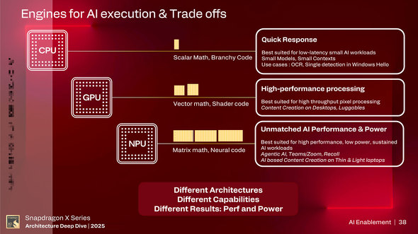 ただし、NPUよりも消費電力が要求されることになるため、可搬性を重視した薄型ノートPCのようなデバイスには向かないということになる。Snapdragonの(省電力性という)設計思想を考えれば、NPUを最も重点的に強化するというのは理にかなっているといえる。