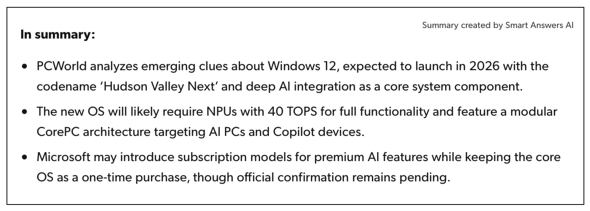 PCWorldに3月4日(米国時間)に掲載された記事だが、下記の記事まとめにあるように「2026年リリース予定とされるWindows 12」「開発コード名は『Hudson Valley Next』でコアシステムのコンポーネントとしてAIを密に統合」「AI PCやCopilot対応デバイスをターゲットに40TOPSのNPUを必須とし、モジュラー型のCorePCアーキテクチャを採用」「MicrosoftはプレミアムなAI機能にサブスクリプションモデルを提供」といった内容がまとまっている。