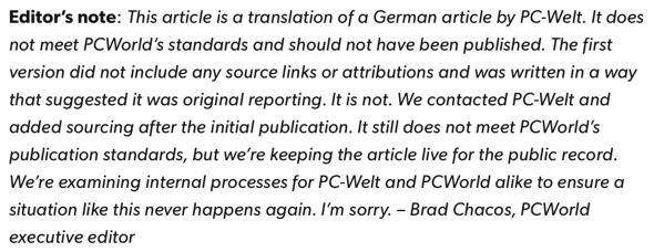 その後、PCWorldの当該記事には「Editor's note」という項目が新たに追加され、当該の記事は(提携誌とみられる)PC-Weltというドイツ語の記事を翻訳してそのまま掲載したが、内容的にPCWorld誌の掲載基準を満たすものではなく、その後PC-Weltに連絡して内容の変更を行ったことを追記している。