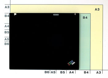 ThinkPad T40は、携帯用ビジネスノートPCとしてはワールドワイドのスタンダードとも言える14.1型サイズの液晶パネルを搭載。A4ファイルに近いサイズで決して小型な機種ではないが、非常に薄い仕上がりとなっている。