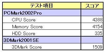 「PCMark2002Pro」と「3DMark2001SE」のペンチマークテスト結果