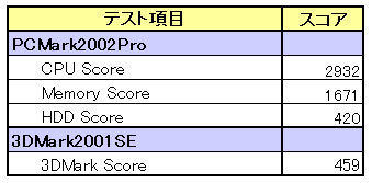 「PCMark2002Pro」と「3DMark2001SE」のペンチマークテスト結果
