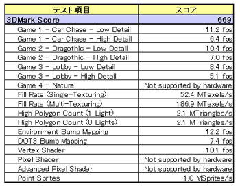 いっぽう、3D性能はどうかというと……、これはあまり期待してはいけない。以下に「3DMark2001SE」の結果を示しておくが、3DMark Scoreで669という値は、正直な話、最低レベルでしかない。3Dゲームなどを満喫したい人には物足りないパフォーマンスとなるだろう。