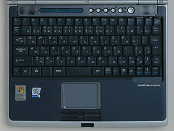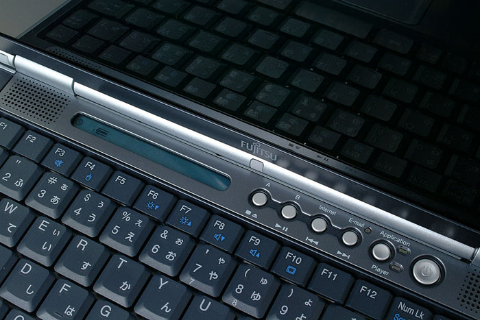 キーボード上部には、電源、バッテリ残量、HDD、光学ドライブなどの状態を表すモノクロ液晶が配置されている。その隣には6つのボタンが並び、両端にはステレオスピーカが内蔵されている(クリックすると拡大します)