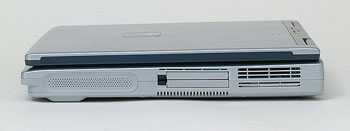 CPUには、デスクトップ用のPentium 4 2.6GHzを搭載する。デスクトップ向けCPUをスペースの限られたノートPCで使用しているため、発熱は気になるところだが、放熱対策はしっかりしており、筐体が熱くなるということはない。CPUの負荷が高いときは冷却用のファンが回り出すが、風切り音はそれほど耳障りではなく、静かな場所でも十分使えそうだ。