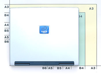 液晶ディスプレイは15型でSXGA+(1,400×1,050ピクセル)対応。現在トレンドとなっているクリアパネルは採用していない。本体の前面には、DVDマルチドライブが装備されている(クリックすると拡大します)